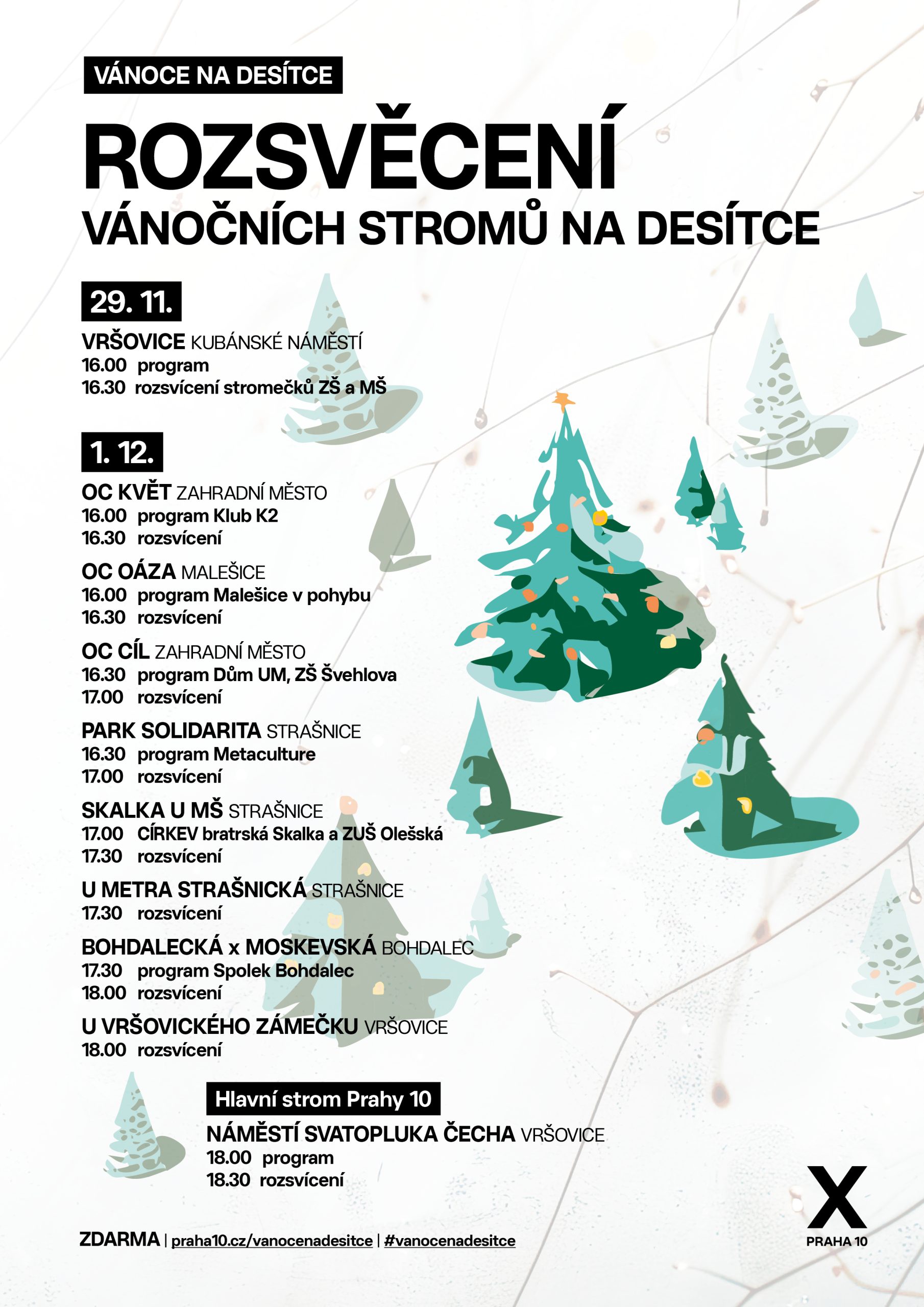 Hlavní strom Prahy 10, Vršovice, náměstí Svatopluka Čecha, program od 18:00 hod. Jeho součástí bude i otevření Ježíškovy nebeské kanceláře, kde budete moci napsat přání Ježíškovi.