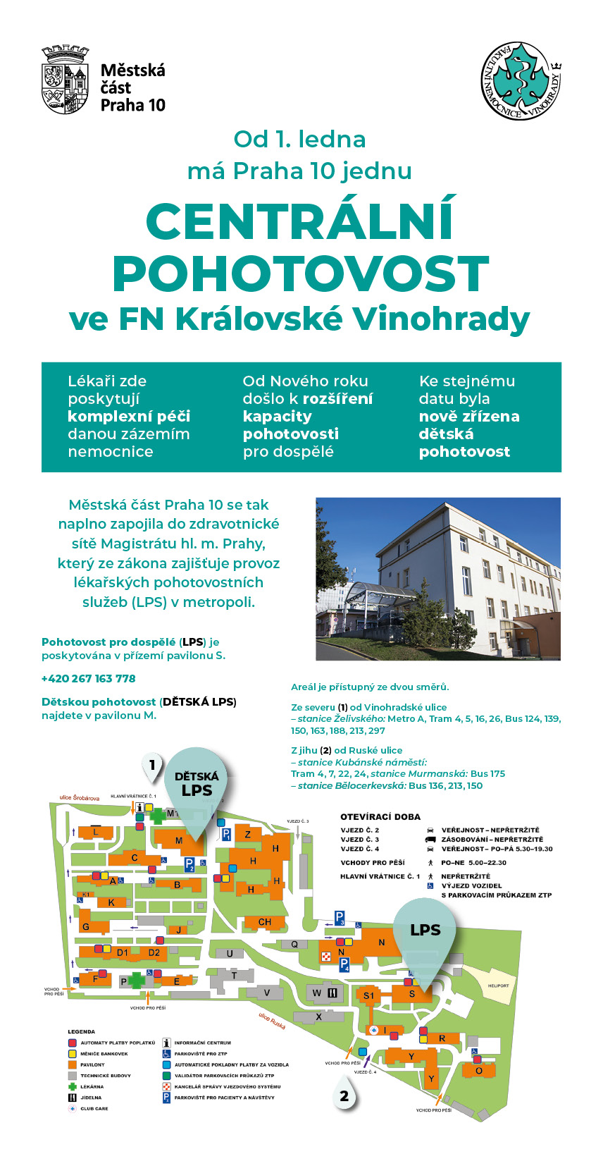 Od 1. ledna 2020 má MČ Praha 10 centrální lékařskou pohotovostní službu (LPS) ve Fakultní nemocnici Královské Vinohrady (FNKV). V ní se rozšíříla kapacita pohotovosti pro dospělé a nově vznikla dětská LPS (ve Vinohradech fungovala nonstop ambulance). Je k dispozici i pacientům z polikliniky Malešice, kde LPS fungovala do konce roku 2019. Desítka se tak plně zapojila do sítě Magistrátu hlavního města Prahy (kompletní soupis služeben na stránkách zdravotni.praha.eu), který je zákonným provozovatelem LPS v metropoli.