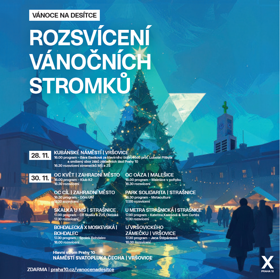 V rámci programu se můžete těšit na adventní slovo faráře Matěje Opočenského, koncert Báry Basikové se smíšeným dětským sborem ze základních škol Prahy 10 a vystoupení mateřských školek Prahy 10. Po celou dobu programu na vás čekají dílničky pro děti a stánky s občerstvením.