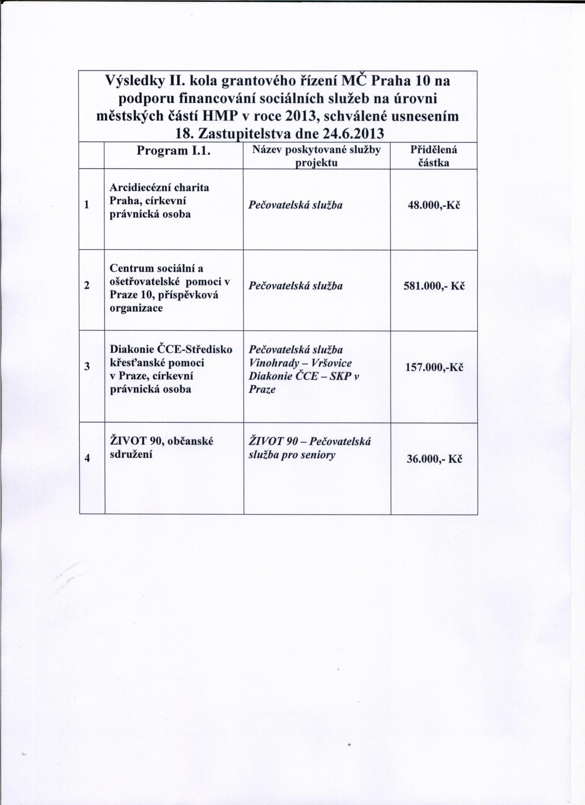 Výsledky grantového řízení MČ Praha 10 na podporu financování sociálních služeb na úrovní městských částí HMP v roce 2013