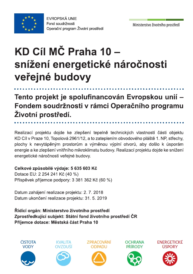 Cílem projektu bylo zlepšení tepelně technických vlastností části objektu KD Cíl v Praze 10 (Topolová 2961/12 – p. p. č. 2078/226) zateplením obvodového pláště 1NP (465,9 m2), střechy (606,5 m2), plochy k nevytápěným prostorům (255,9 m2) a výměnou výplní otvorů (195,2 m2) tak, aby došlo k úsporám energie a ke zlepšení vnitřního mikroklimatu.