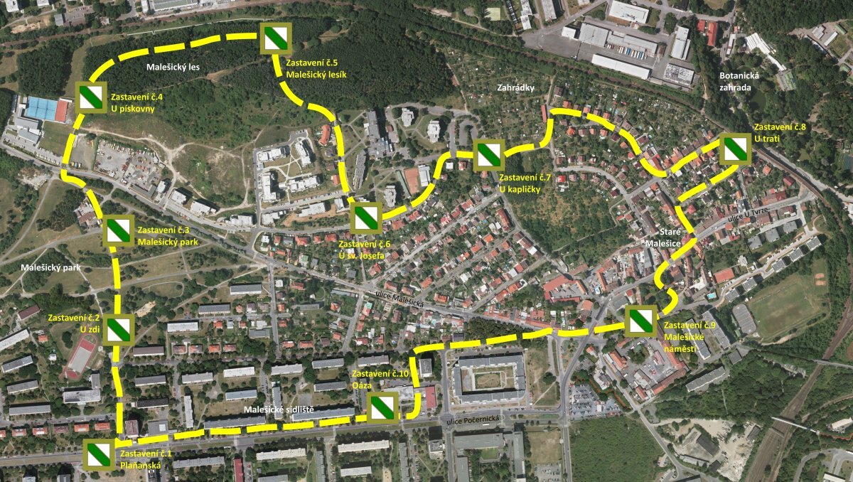 Přibližně 4 km dlouhý okruh, který prochází novou i starší zástavbou, lesem a Malešickým parkem. Na stezce je deset zastavení s informacemi, které se vážou k této městské čtvrti, k její historii, významnějším památkám a dalším zajímavostem o životě v Malešicích. Naučná stezka vznikla přičiněním místního sdružení Českého svazu ochránců přírody – „Natura, quo vadis?“.