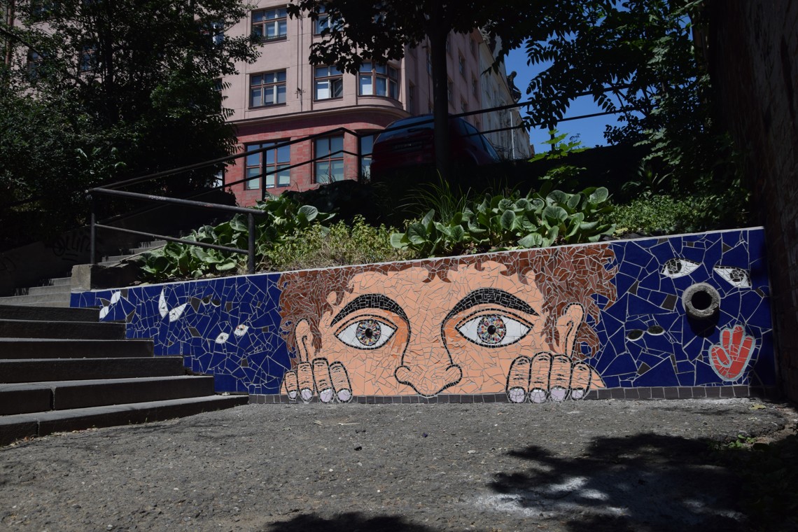 Doplnění prostoru mezi schodišti v Borodinské ulici ve Vršovicích o mozaiku z barevných obkladů