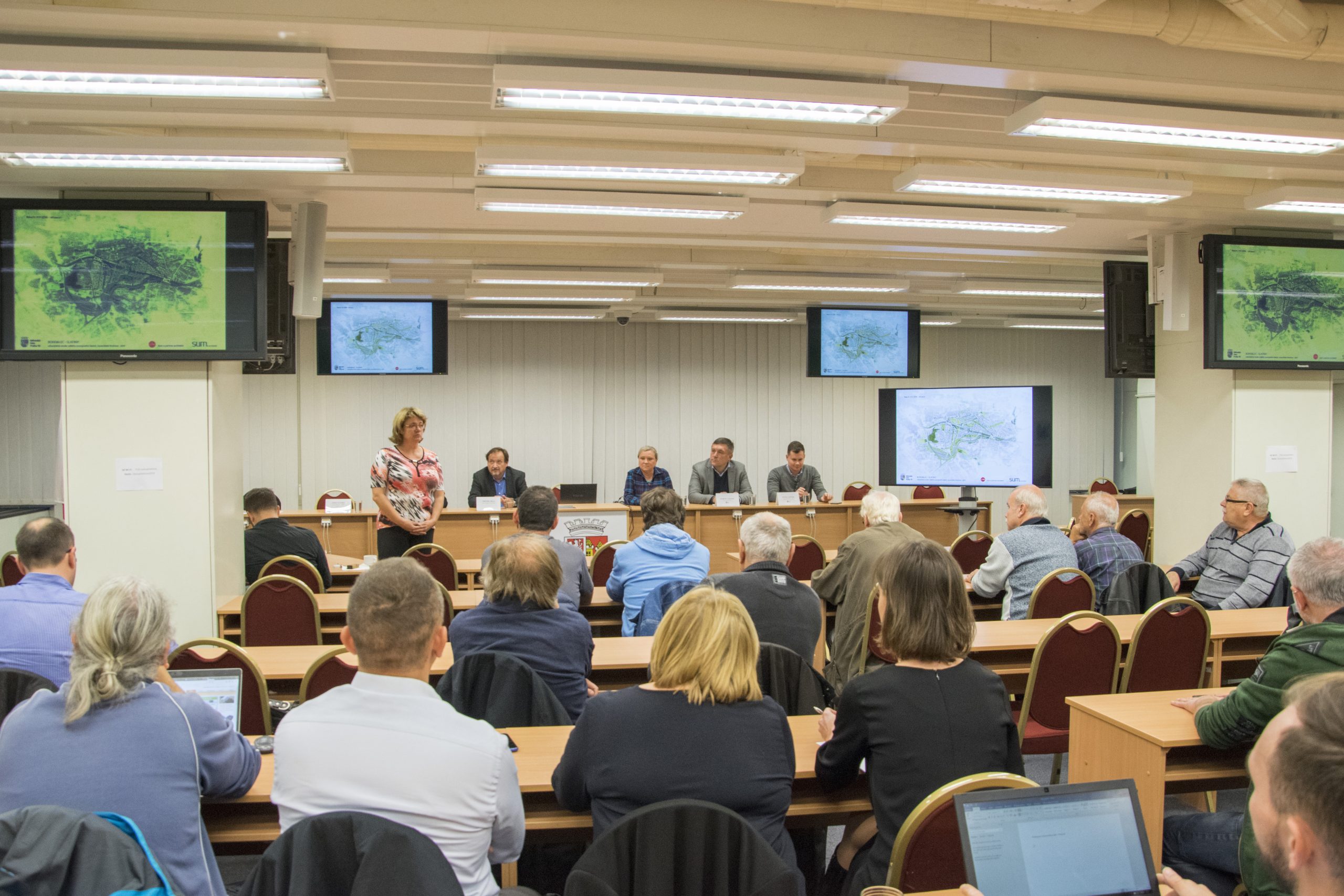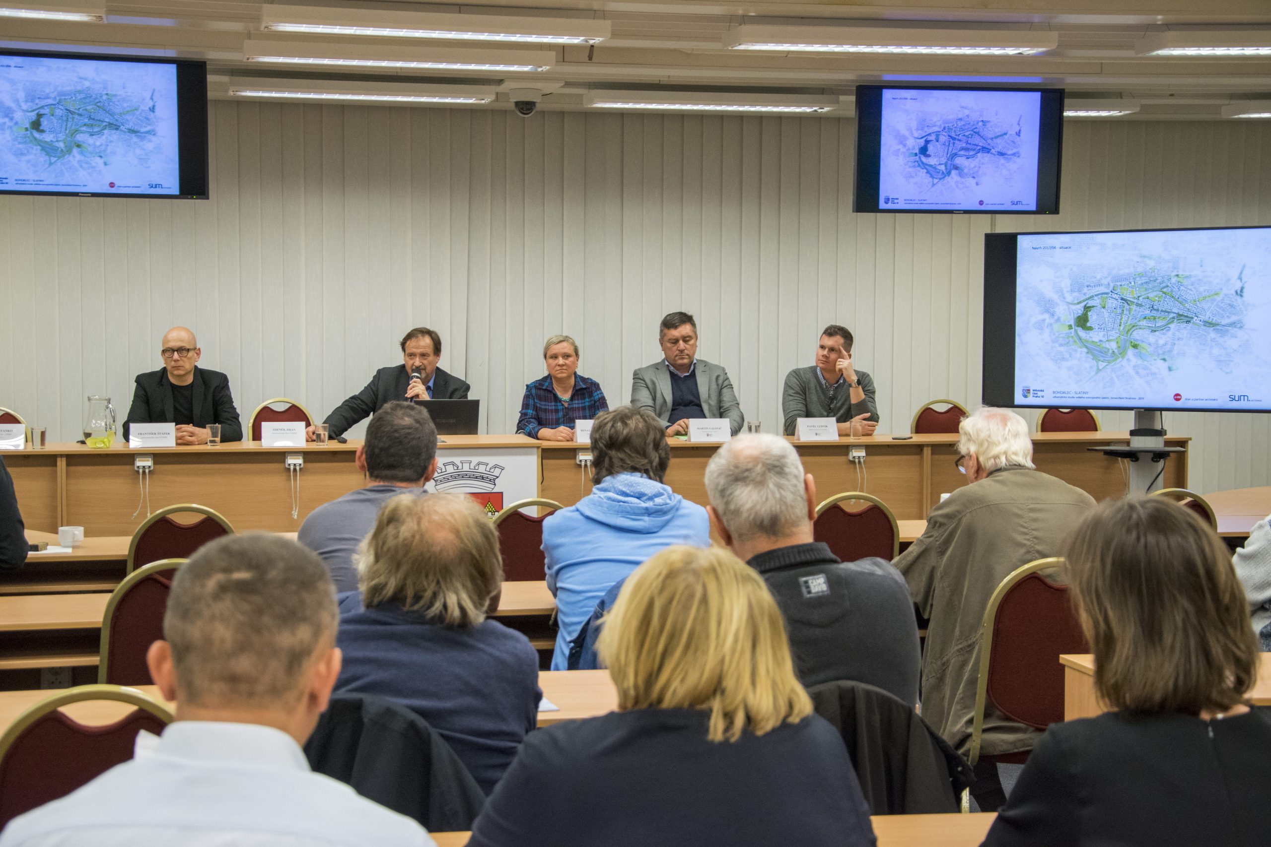 Foto z představení urbanistické studie Bohdalec Slatiny brownfield Strašnice v zastupitelském sále MČ Praha 10: